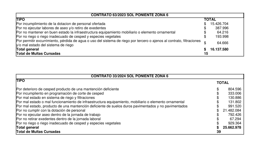 39 multas por un total de $25.662.978 en el contrato 33/2024 para la misma zona
