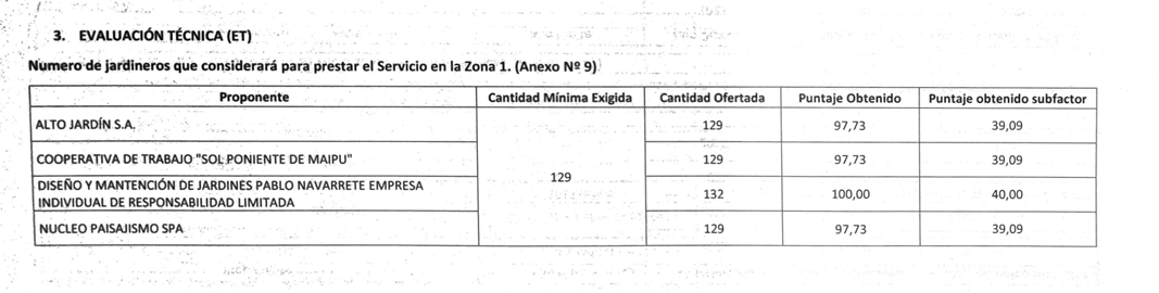 En el ítem técnico, la cooperativa comprometió 129 jardineros para la Zona 1, obteniendo un puntaje de 97,73 sobre 100, al igual que otros oferentes.