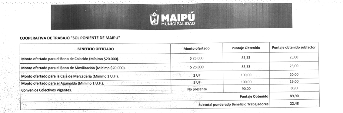 Respecto de las remuneraciones mensuales, la propuesta fue de $550.000 brutos por trabajador, lo que le otorgó un puntaje de 90,98 en ese subfactor. Aunque está por sobre el mínimo exigido ($515.000), fue menor que otras ofertas como la de Pablo Navarrete EIRL ($604.500).