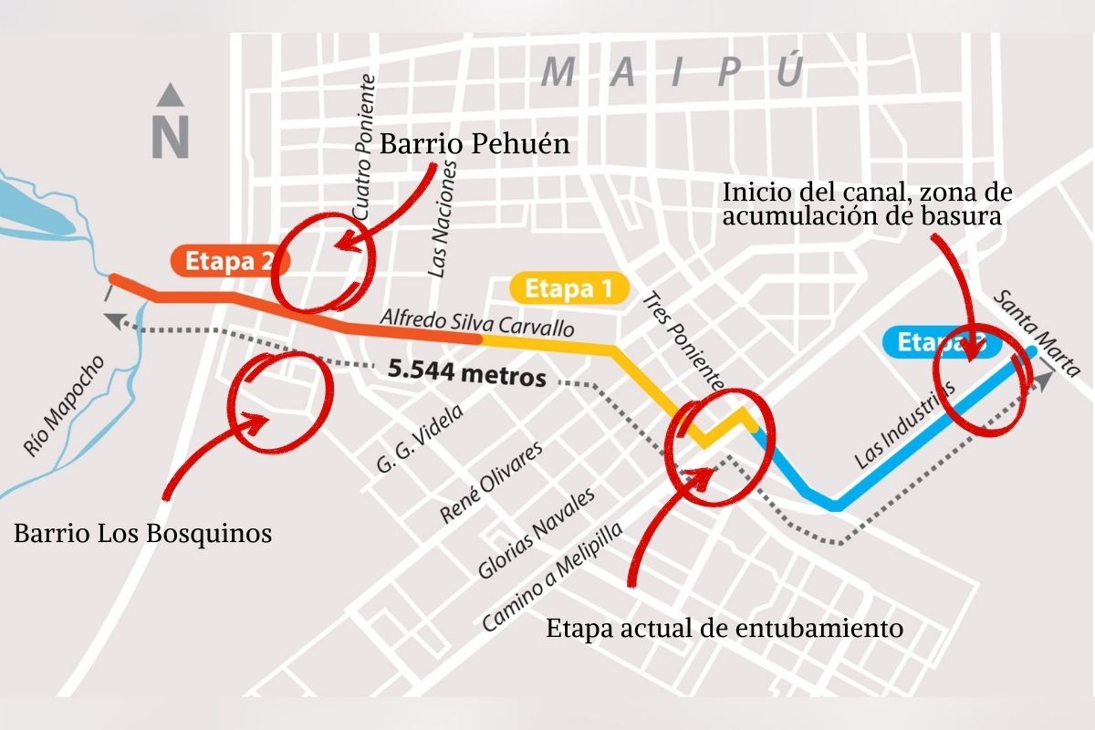 Esta fase contempla cerca de 466 metros entre el cruce de Camino a Melipilla con Tres Poniente y la intersección de Del Ferrocarril con Cerro Barón. Ese segmento corresponde a una fracción del total del canal, que supera los cinco kilómetros de extensión y una inversión cercana a $60 mil millones de pesos.