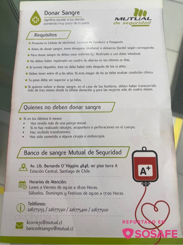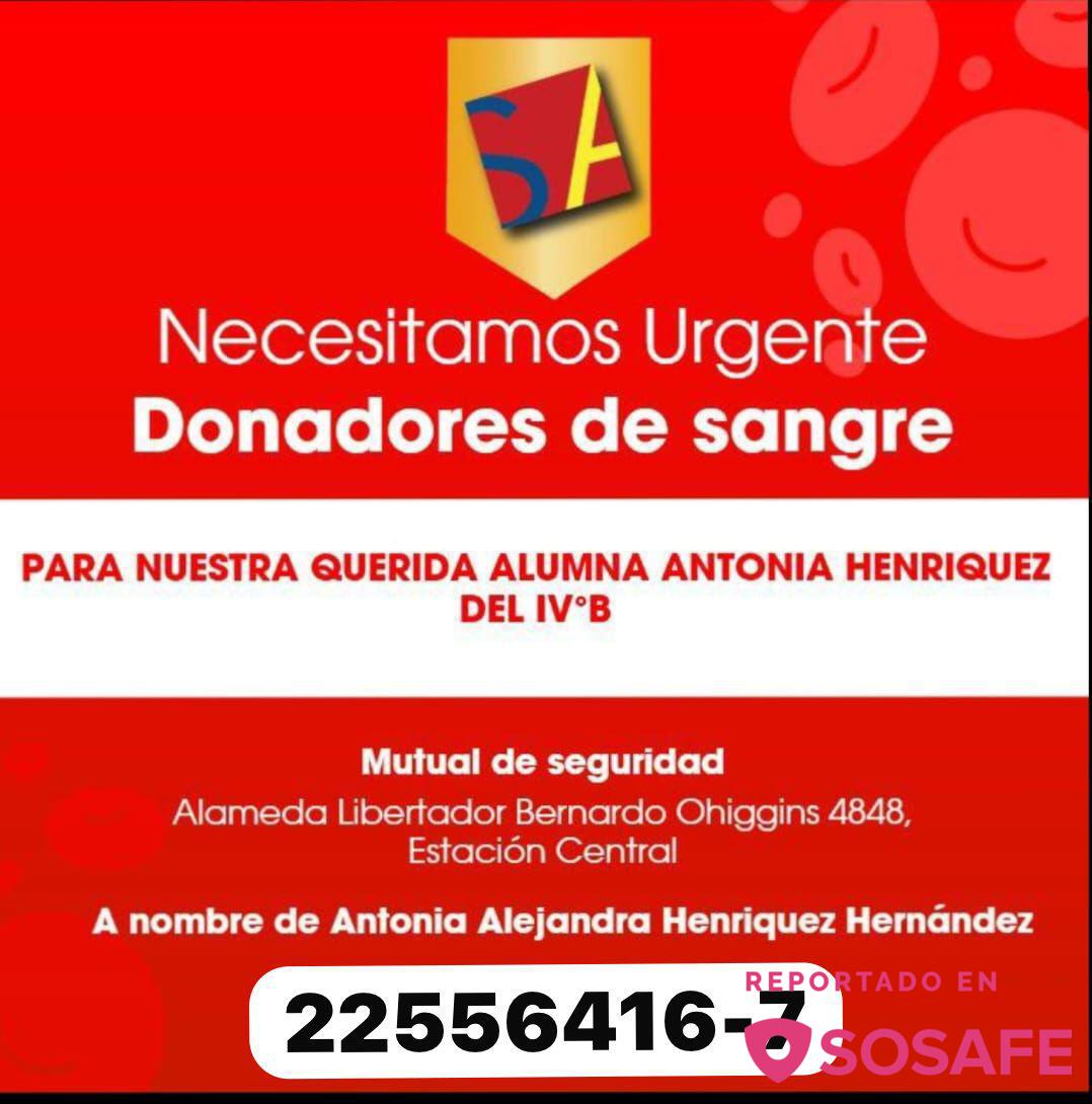 El banco de sangre de la Mutual de Seguridad, ubicado en Av. Libertador Bernardo O’Higgins 4848, 1er piso, Torre A, Estación Central, recibe donaciones para Antonia.