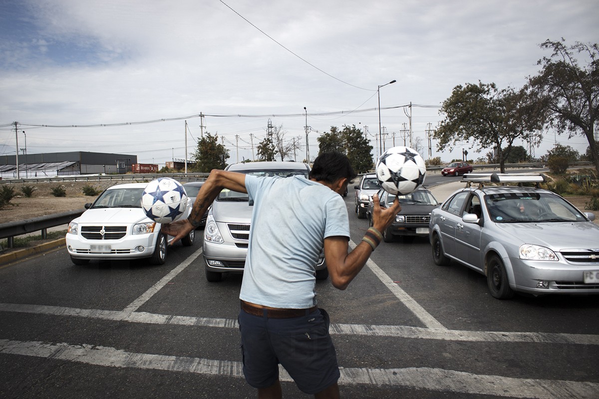 (Héctor a la izquierda, Manuel a la derecha) Manuel toma sus balones de fútbol y comienza a girarlos sobre la punta de sus dedos, mientras otro balón rebota sobre su cabeza. Un público apresurado sobre sus vehículos hace sonar sus bocinas en señal de aprobación, para que el actor se acerque y reciba el pago en monedas de un efímero show de semáforo.