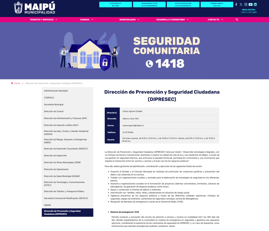 La Seguridad Comunitaria de la Municipalidad de Maipú, operada bajo la Dirección de Prevención y Seguridad Ciudadana (DIPRESEC), a la cual se puede recurrir en el celular o teléfono marcando el Número de emergencia: 1418, se presenta como un organismo clave para la seguridad de los residentes de la comuna, ya que su misión es «desarrollar estrategias integrales, con un enfoque territorial e intersectorial, destinado a mejorar la calidad de vida de los y las residentes de Maipú, a través de una gestión en seguridad efectiva».