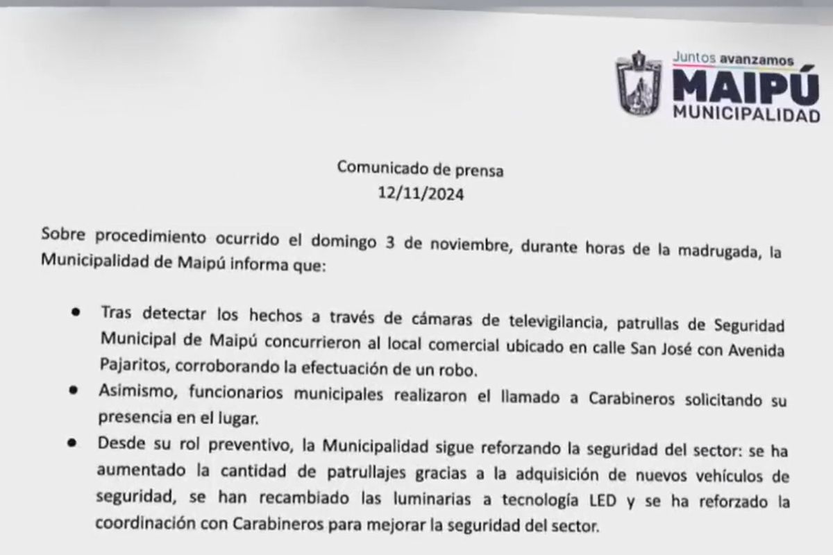 La respuesta oficial de la municipalidad de Maipú fue un escueto comunicado en el que afirmaron haber llamado a Carabineros tras detectar el incidente a través de las cámaras de televigilancia. Sin embargo, los registros muestran una evidente falta de coordinación y seguimiento, lo que permitió que los delincuentes regresaran cuatro veces más durante la misma madrugada.