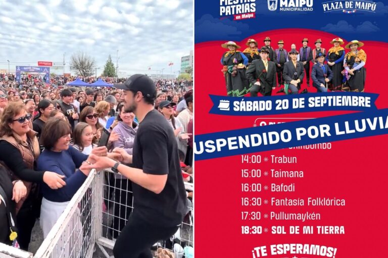 La Fiesta Costumbrista de Maipú, que se celebraba en la Plaza de Maipú del 17 al 20 de septiembre, fue suspendida para el sábado 20 debido a los pronósticos de lluvia. El alcalde de Maipú, Tomás Vodanovic, en sus redes sociales expresó: "Lamentablemente la jornada de mañana, sábado 20 de septiembre, fue suspendida por lluvias. Debemos cuidar a los equipos para que … [Leer más...]