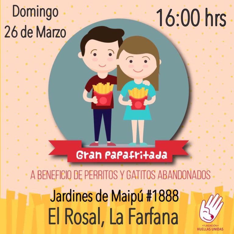 La joven Fundación Huellas Unidas invita a las y los vecinos de Maipú a participar en su primer evento. Se trata de una Gran Papafritada, a realizarse el día domingo 26 de marzo a las 16:00 hrs., en Jardines de Maipú 1888, El Rosal, La Farfana. Toda la recaudación irá en beneficio de animalitos abandonados y maltratados. ¡No faltes! … [Leer más...]