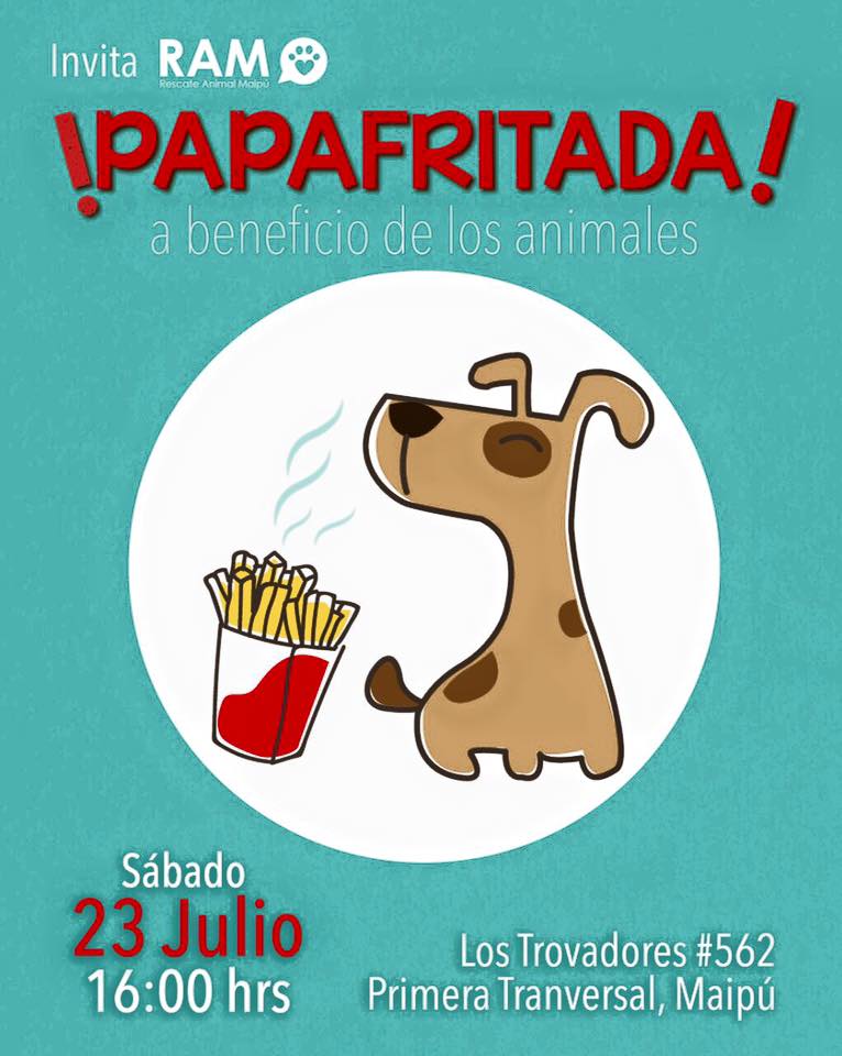 La agrupación Rescate Animal Maipú está invitando a todas y todos los vecinos "a comer exquisitas papitas para ayudar a los animalitos de la calle". La jornada tendrá lugar en Los Trovadores 562 (referencia: Primera Transversal con Av. Central Gonzalo Pérez Llona). El dinero recaudado será destinado a socorrer a perritos y gatitos abandonados de la comuna y … [Leer más...]