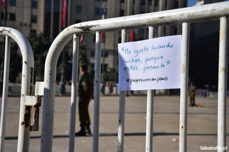 "Chao carrera docente, por dignidad", dice el enorme lienzo que desplegaron, la tarde del lunes 06 de julio, profesoras y profesores del colegio Reina de Suecia, de la comuna de Maipú, exigiendo el retiro del proyecto de ley impulsado desde el ejecutivo. Esto, en la misma grúa de la que, desde hace tres semanas, pende una camioneta del Consorcio Constructora Línea 3, a cargo … [Leer más...]