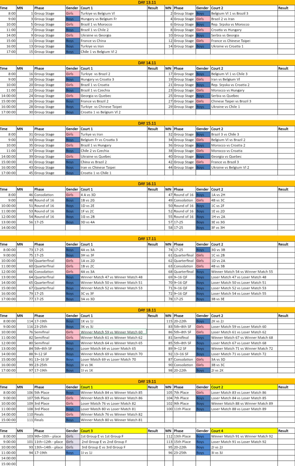 Los dirigidos por el profesor Gonzalo Vergara Quintanilla debutarán, en horario chileno, este jueves 13 de noviembre a las 17:00 horas frente a Bélgica, continuando su participación el viernes 14 ante Ucrania, y cerrando la fase de grupos el sábado 15 frente a Croacia, en el mismo horario los partidos.