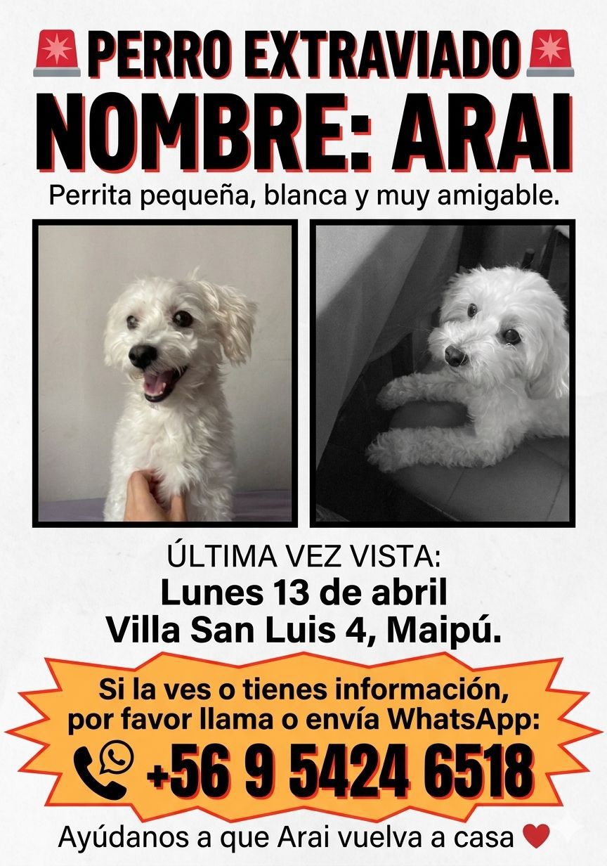 Una familia del barrio Sol Poniente, en Maipú, se encuentra buscando a su perrita Arai, extraviada desde el lunes 13 de abril en la Villa San Luis 4.