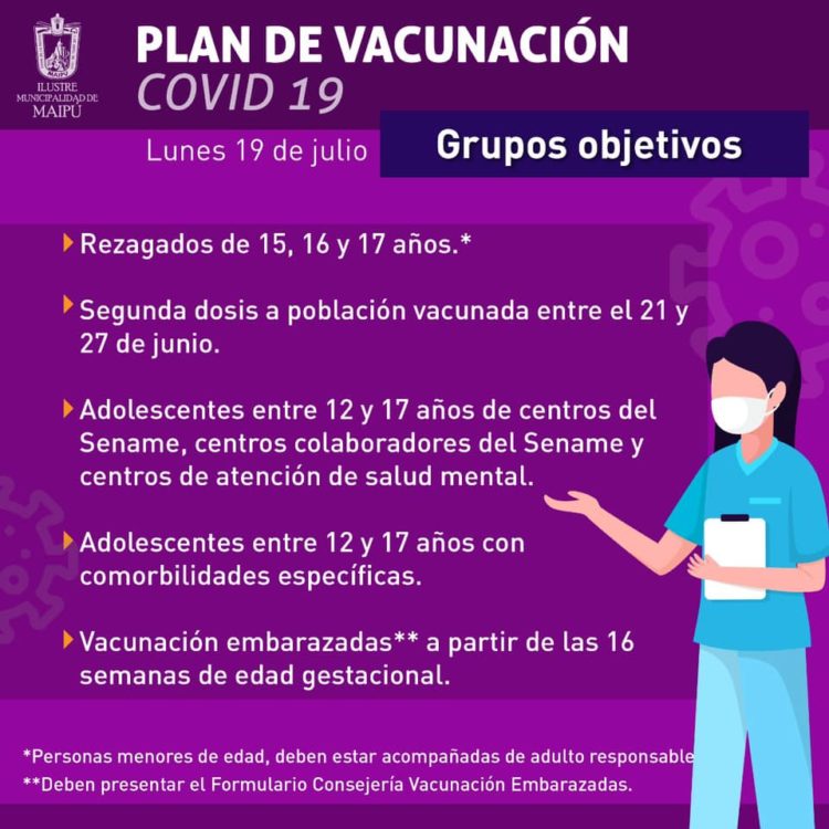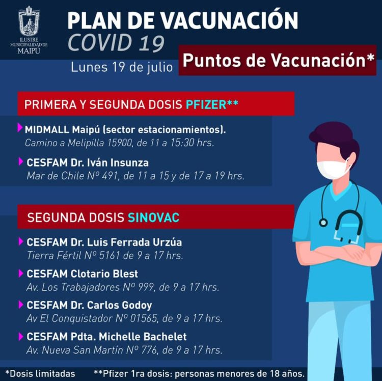 Mientras que el municipio de Maipú hizo público el plan de vacunación contra el covid-19 para este lunes 19 de julio, indicando los grupos objetivos y los puntos de vacunación habilitados en la comuna.