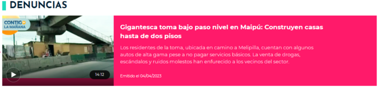 En el programa Contigo en la mañana de Chilevisión se hace un reportaje más sobre esta zona de Maipú, que se titula: «GIGANTESCA TOMA BAJO PASO NIVEL EN MAIPU«, y que prodiga abundante material audiovisual.