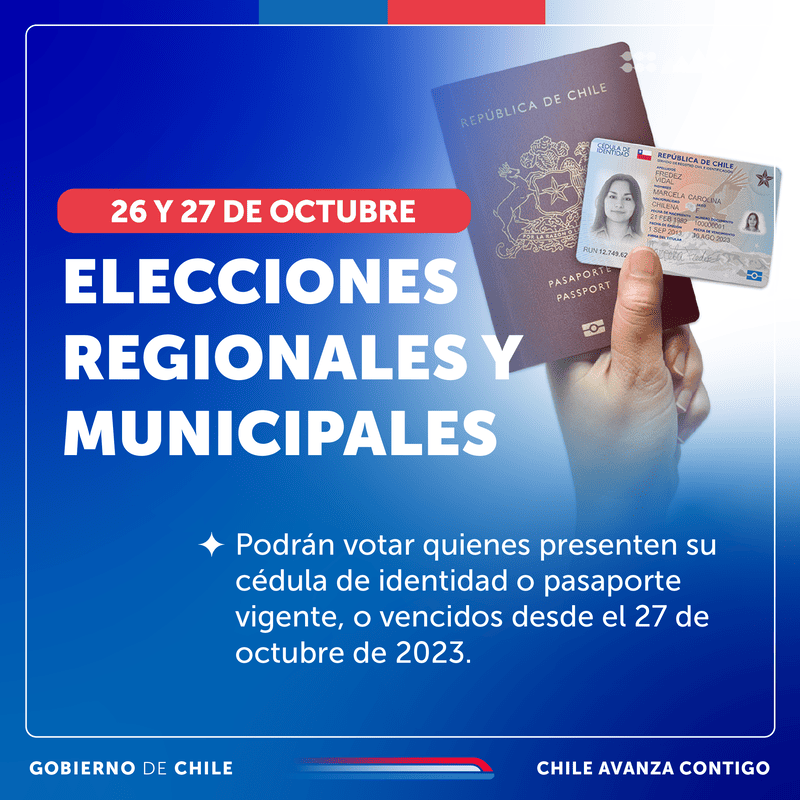 A pocos días de las elecciones municipales y regionales del 26 y 27 de octubre, el Ministerio de Justicia y Derechos Humanos y el Servicio de Registro Civil han aclarado las condiciones sobre los documentos necesarios para ejercer el derecho al voto. Tanto la cédula de identidad como el pasaporte serán aceptados, incluso si están vencidos, siempre que la fecha de vencimiento sea posterior al 27 de octubre de 2023.