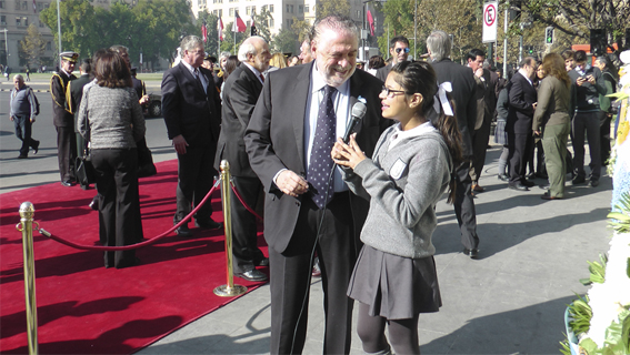 Con mucho afecto el Embajador Ginés González, se acercó y saludó a los alumnos del Colegio maipucino, una vez finalizado los actos y concedió una entrevista a las alumnas Scarlett Troncoso (en la cámara) y Diana Burgos(entrevistadora) que llamaron la atención de las autoridades presentes por la seriedad de su trabajo.
