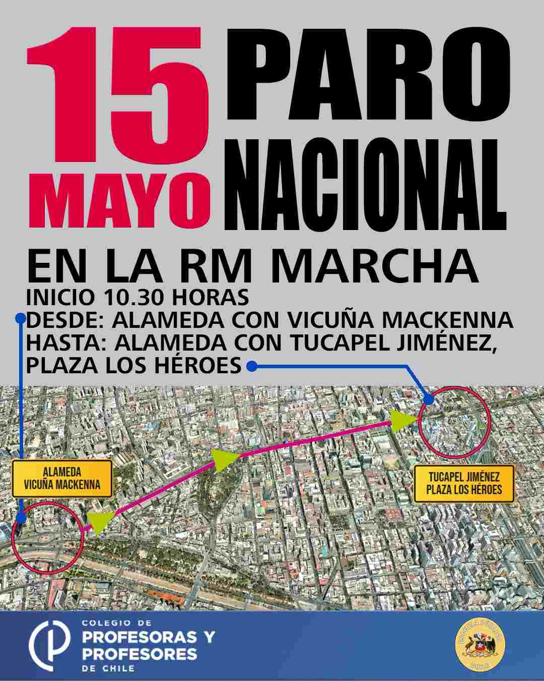 El Comunal Maipú del Colegio de Profesores informó que el punto de encuentro para la jornada de paro será a las 09:00 horas en el Metro Santiago Bueras, frente al SLEP Santa Corina. Desde allí, docentes de Maipú se reunirán con colegas de Cerrillos y Estación Central y marcharán hacia el Metro Baquedano, uniéndose a la movilización regional que concluirá en Plaza Los Héroes.