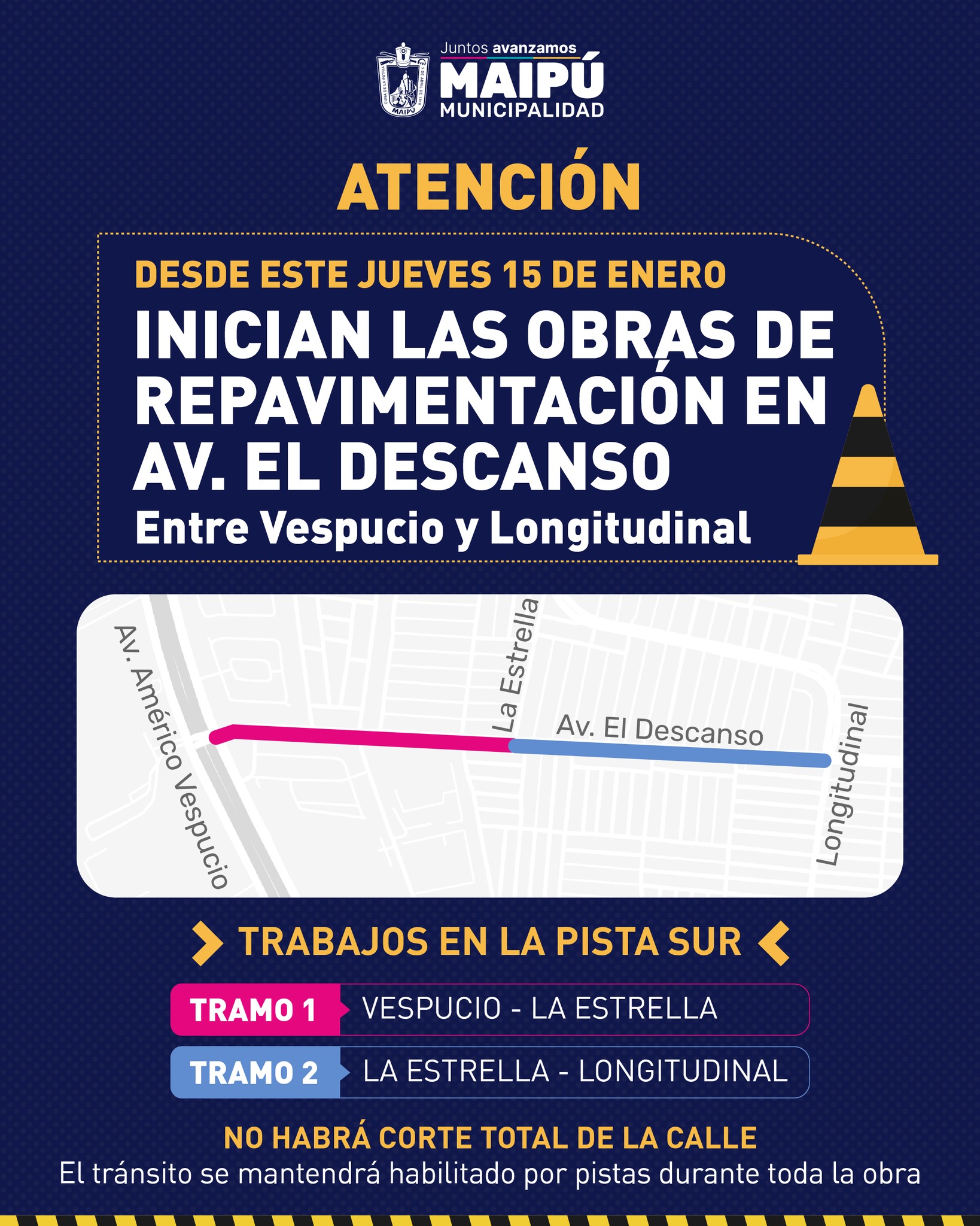 Desde este jueves 15 de enero comenzaron las obras de repavimentación en avenida El Descanso, en el tramo comprendido entre avenida Américo Vespucio y Longitudinal, en el barrio Longitudinal de Maipú.