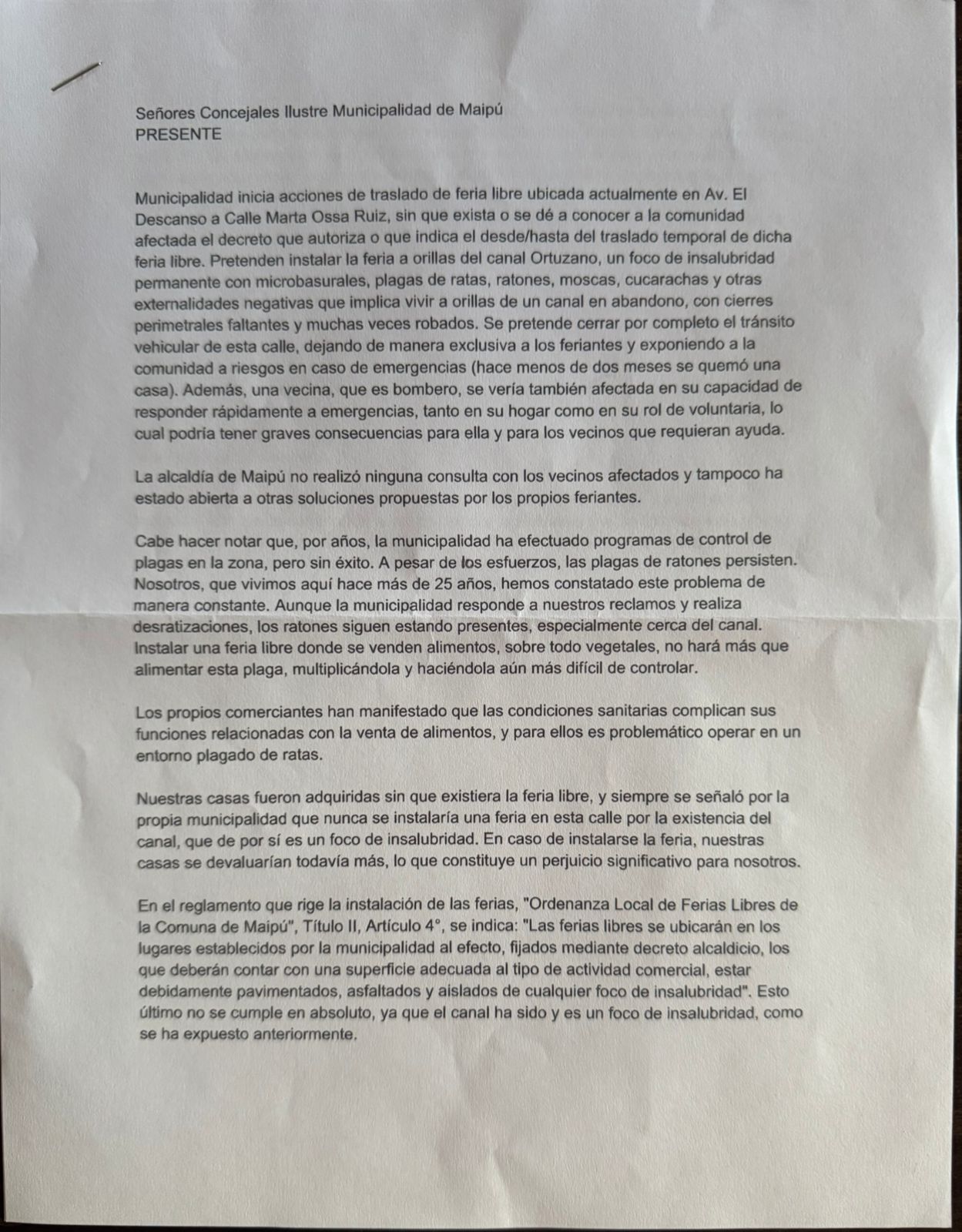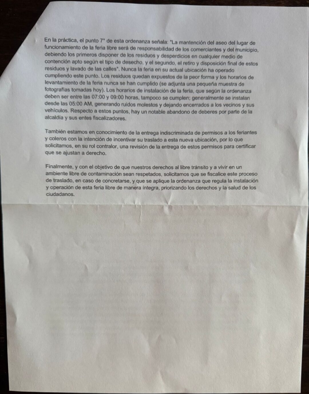 En ella, critica duramente la falta de cumplimiento de las normativas vigentes sobre el aseo y funcionamiento de la Feria Libre, acusando «un Notable Abandono de Deberes por parte de la Alcaldía y sus entes fiscalizadores«.