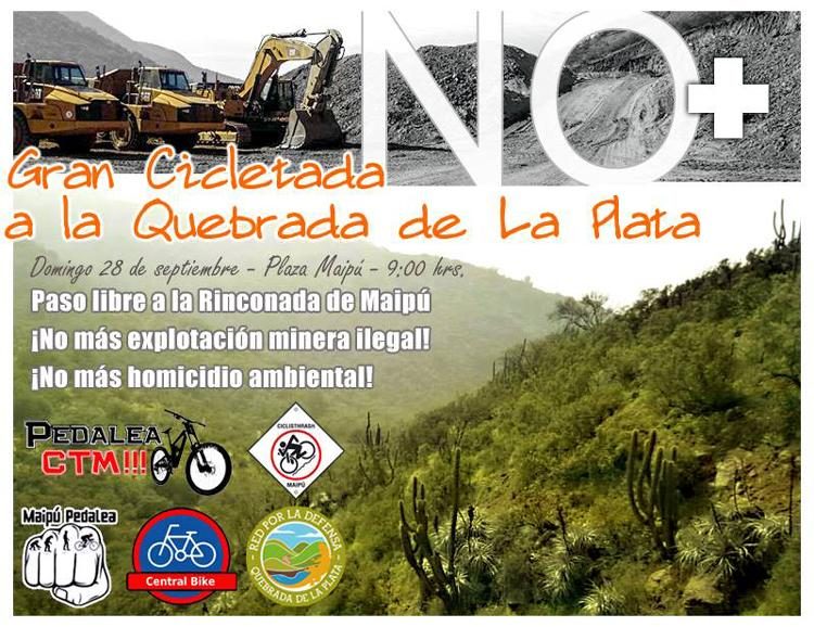 La Red Quebrada de La Plata y organizaciones de ciclistas de Maipú y Padre Hurtado han convocado para el próximo domingo 28 de septiembre de 2014 a las 09:00 hrs. a una cicletada familiar por la defensa de la Quebrada de La Plata.