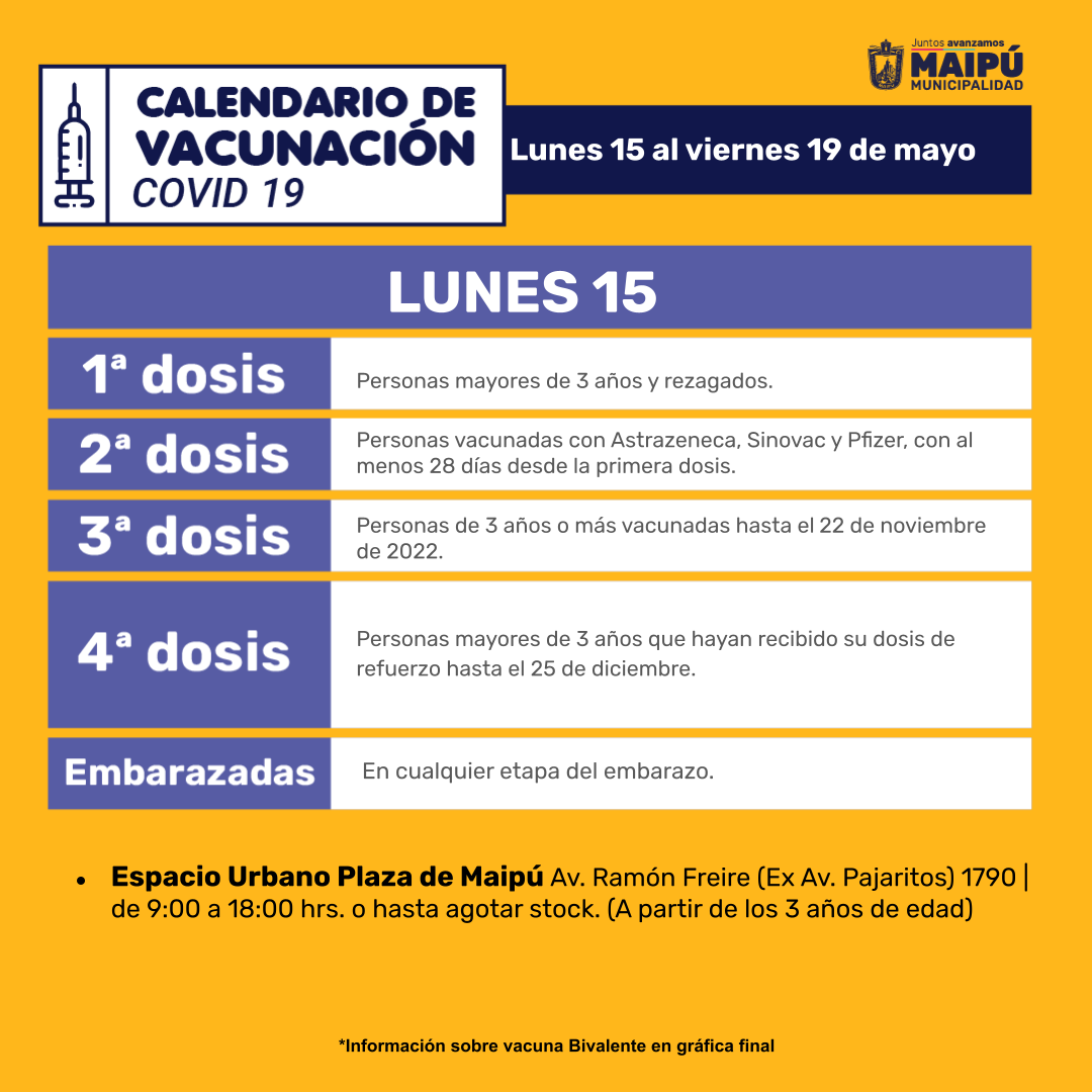 A continuación, el Calendario de vacunación contra el Covid-19 con sus respectivos locales de vacunación y horarios de atención: