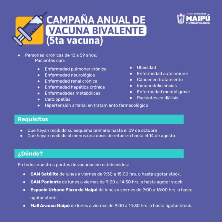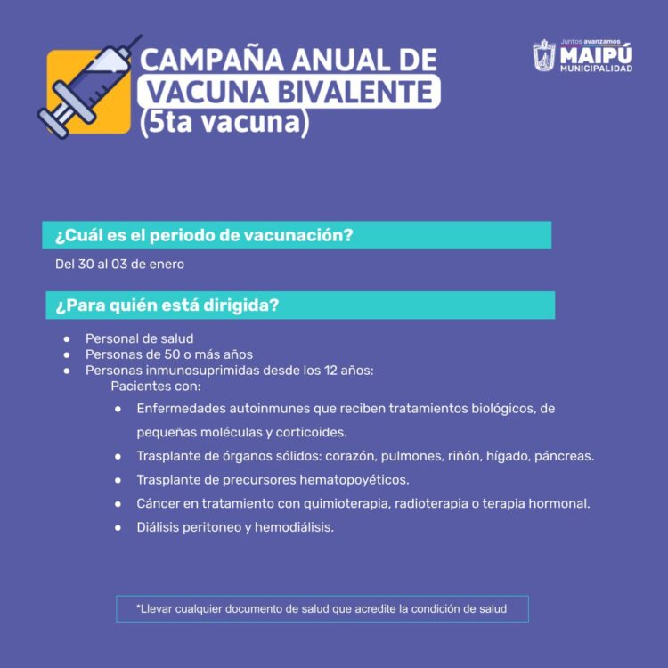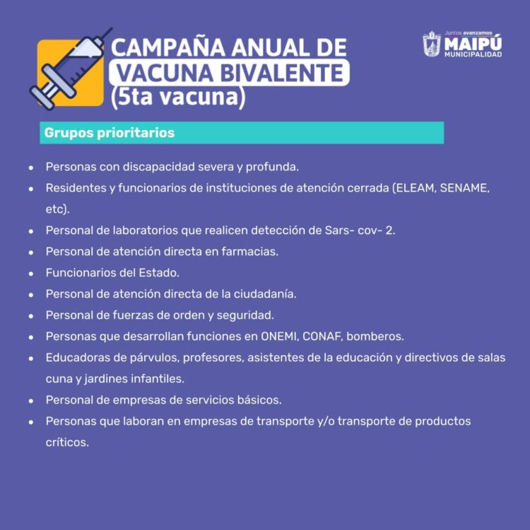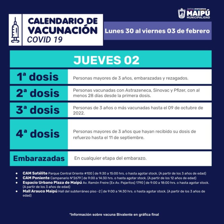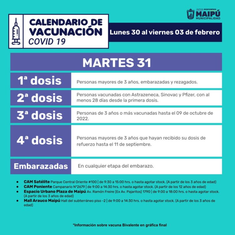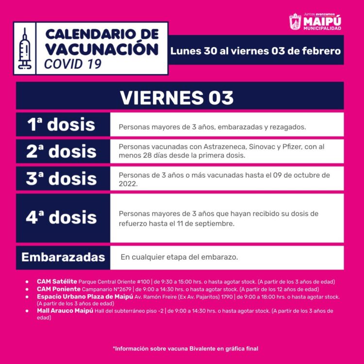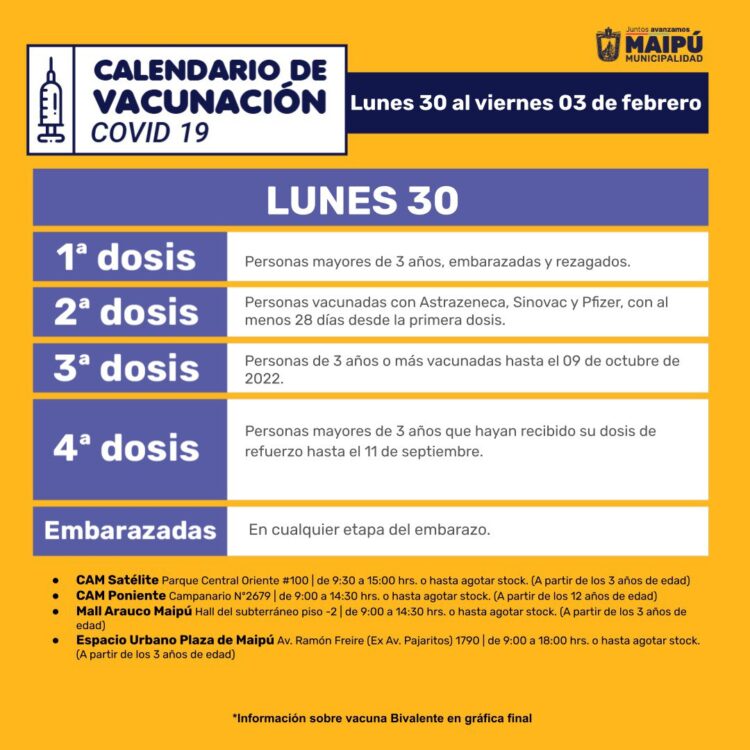 A continuación, el Calendario de vacunación del Ministerio de Salud para la semana del 30 de enero al 5 de febrero de 2023, seguido del Calendario de vacunación de la Municipalidad de Maipú con sus respectivos locales de vacunación y horarios de atención.