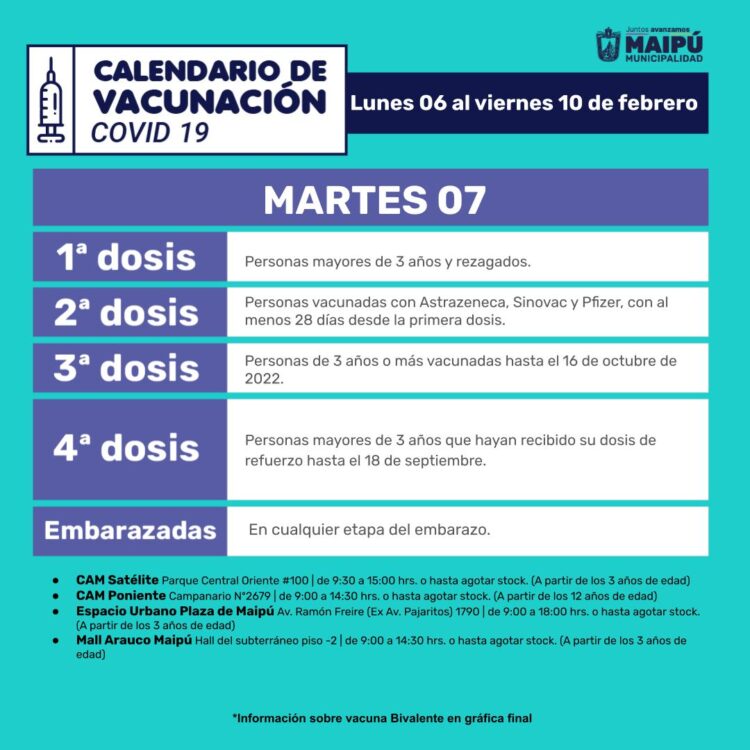 A continuación, el Calendario de vacunación del Ministerio de Salud para la semana del 6 al 12 de febrero de 2023, seguido del Calendario de vacunación de la Municipalidad de Maipú con sus respectivos locales de vacunación y horarios de atención.