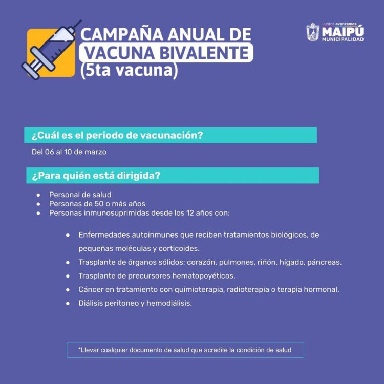 A continuación, el Calendario de vacunación del Ministerio de Salud para la semana del 6 al 12 marzo de 2023, seguido del Calendario de vacunación de la Municipalidad de Maipú con sus respectivos locales de vacunación y horarios de atención.