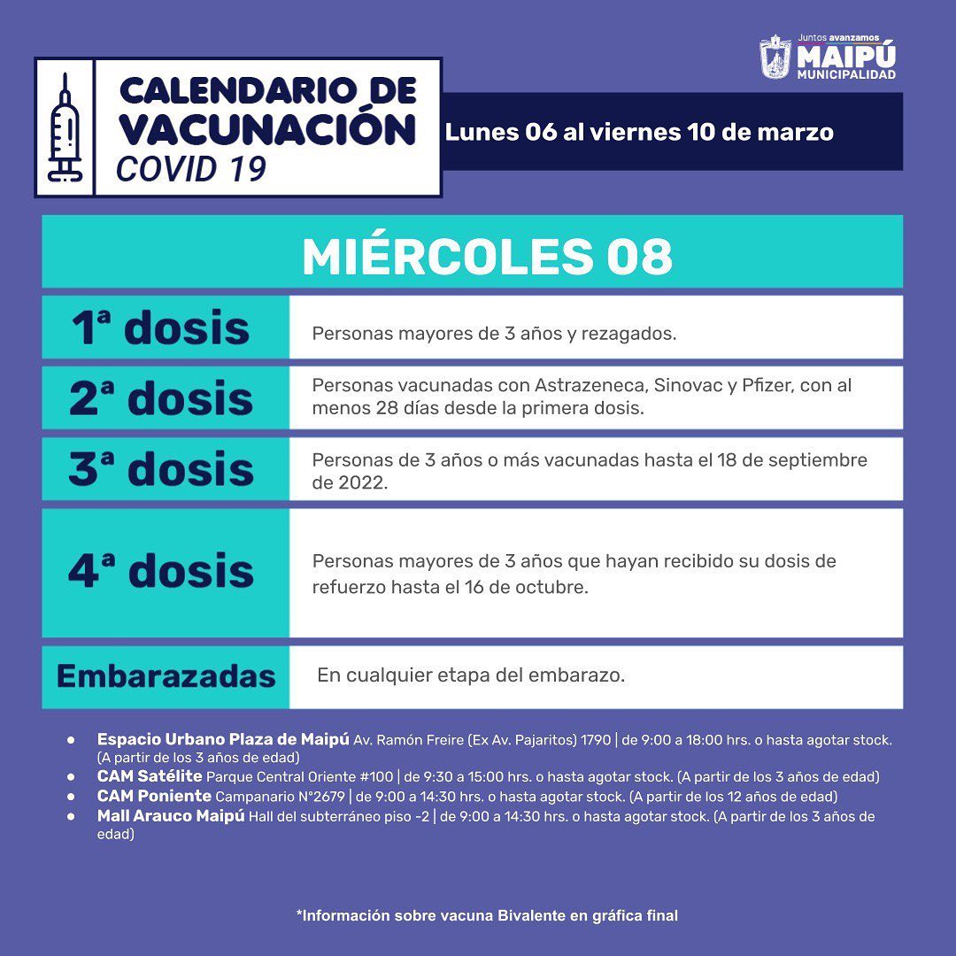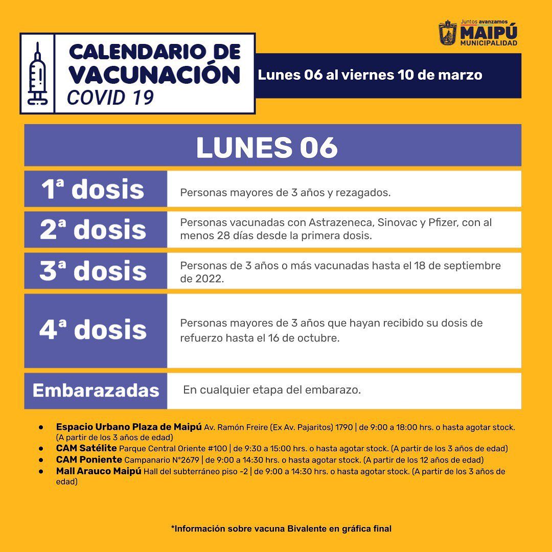A continuación, el Calendario de vacunación del Ministerio de Salud para la semana del 6 al 12 marzo de 2023, seguido del Calendario de vacunación de la Municipalidad de Maipú con sus respectivos locales de vacunación y horarios de atención.