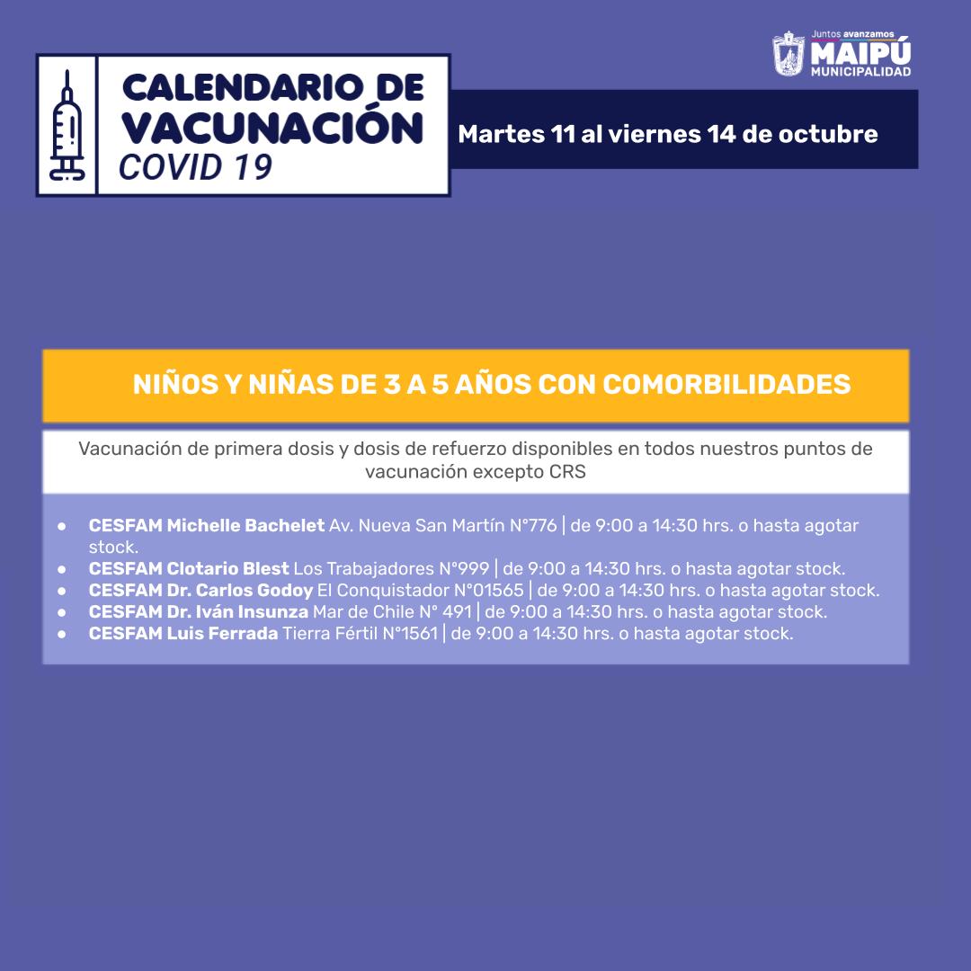 A continuación, el Calendario de vacunación del Ministerio de Salud para la semana del 10 al 16 de octubre de 2022, seguido del Calendario de vacunación de la Municipalidad de Maipú con sus respectivos locales de vacunación y horarios de atención.