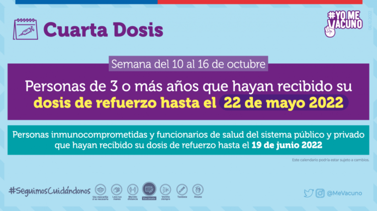 - Cuarta dosis a personas inmunocomprometidas y funcionarios de salud del sistema público y privado que hayan recibido su dosis de refuerzo hasta el 19 de junio 2022.