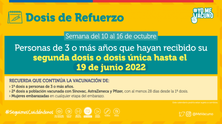 - Dosis de refuerzo a personas de 3 o más años que hayan recibido su segunda dosis o dosis única hasta el 19 de junio 2022.
