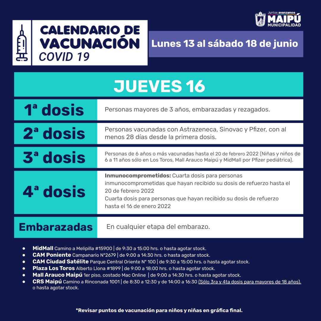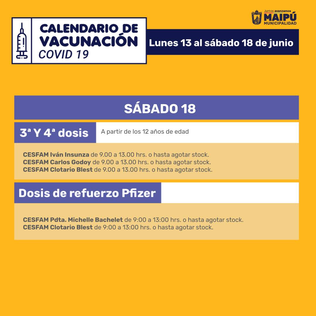 • CRS Maipú (camino a Rinconada 1001) de 8:30 a 12:30 hrs. y de 14:00 a 16:00 hrs. (sólo tercera y cuarta dosis para mayores de 18 años) o hasta agotar stock.