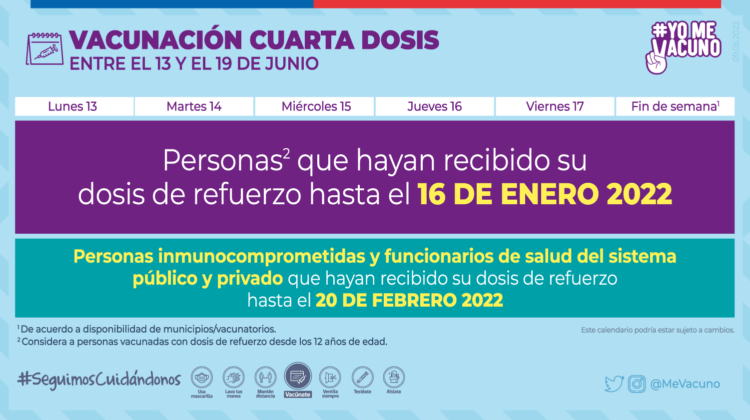 • También a personas inmunocomprometidas y funcionarios de salud del sistema público y privado que hayan recibido su dosis de refuerzo hasta el 20 de febrero 2022 (presentando receta o certificado que acredite su condición de salud).