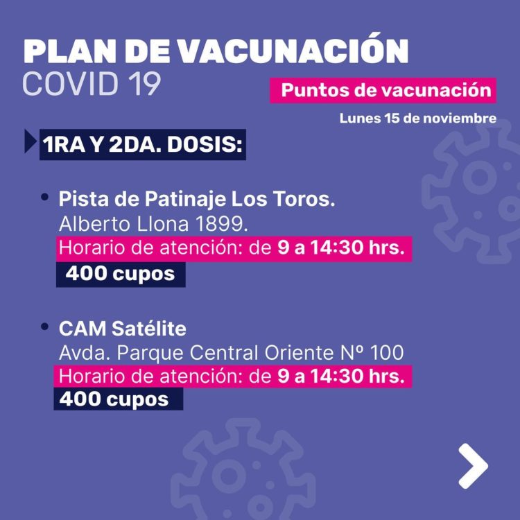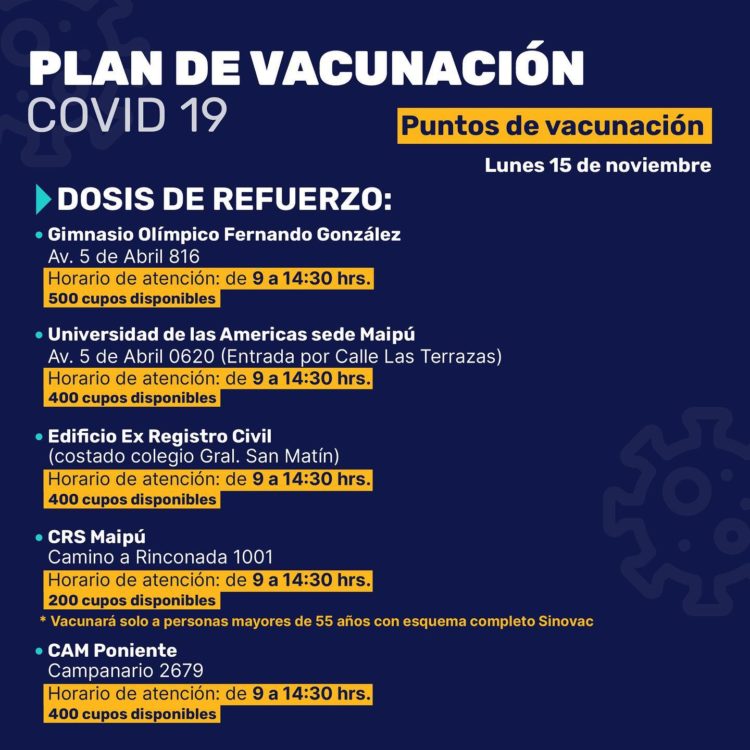 Los siguientes locales de vacunación estarán disponibles en Maipú, con cupos limitados, el día lunes 15 de noviembre (los siguientes días de la semana se informará en las redes sociales del municipio de Maipú):