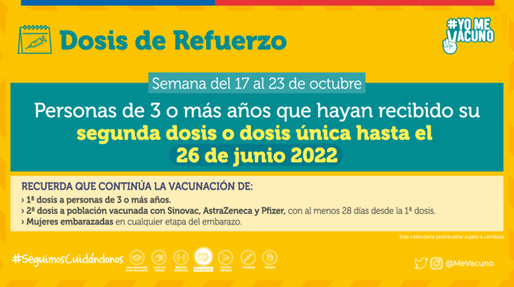 • Dosis de refuerzo a personas de 3 o más años que hayan recibido su segunda dosis o dosis única hasta el 26 de junio 2022.