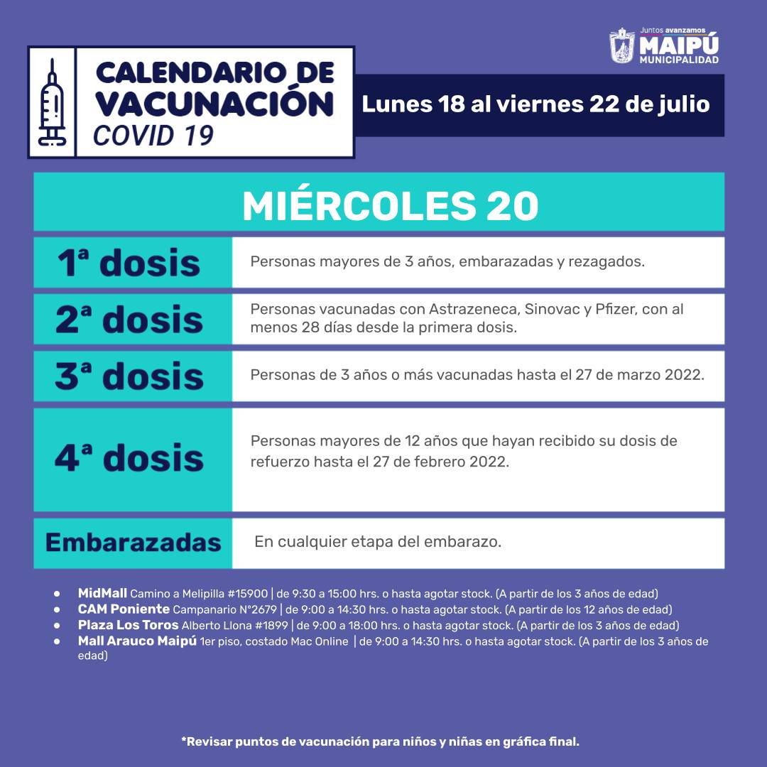 A continuación el Calendario de vacunación del Ministerio de Salud (Minsal) para la semana del 18 al 24 de julio de 2022. Luego se detalla el Calendario de vacunación de la Municipalidad de Maipú con sus respectivos locales de vacunación y horarios de atención.