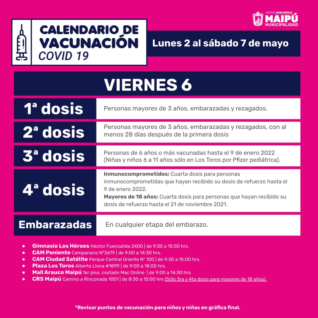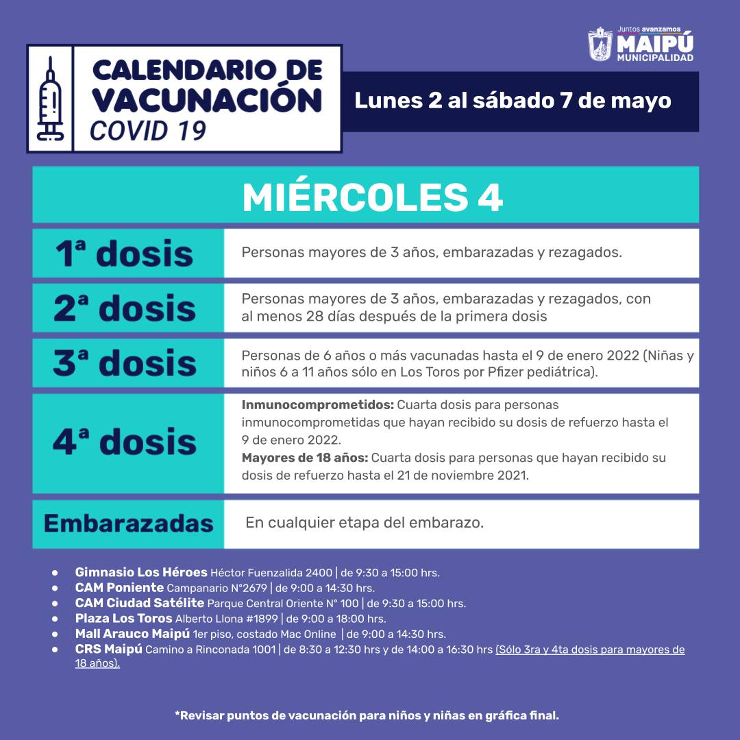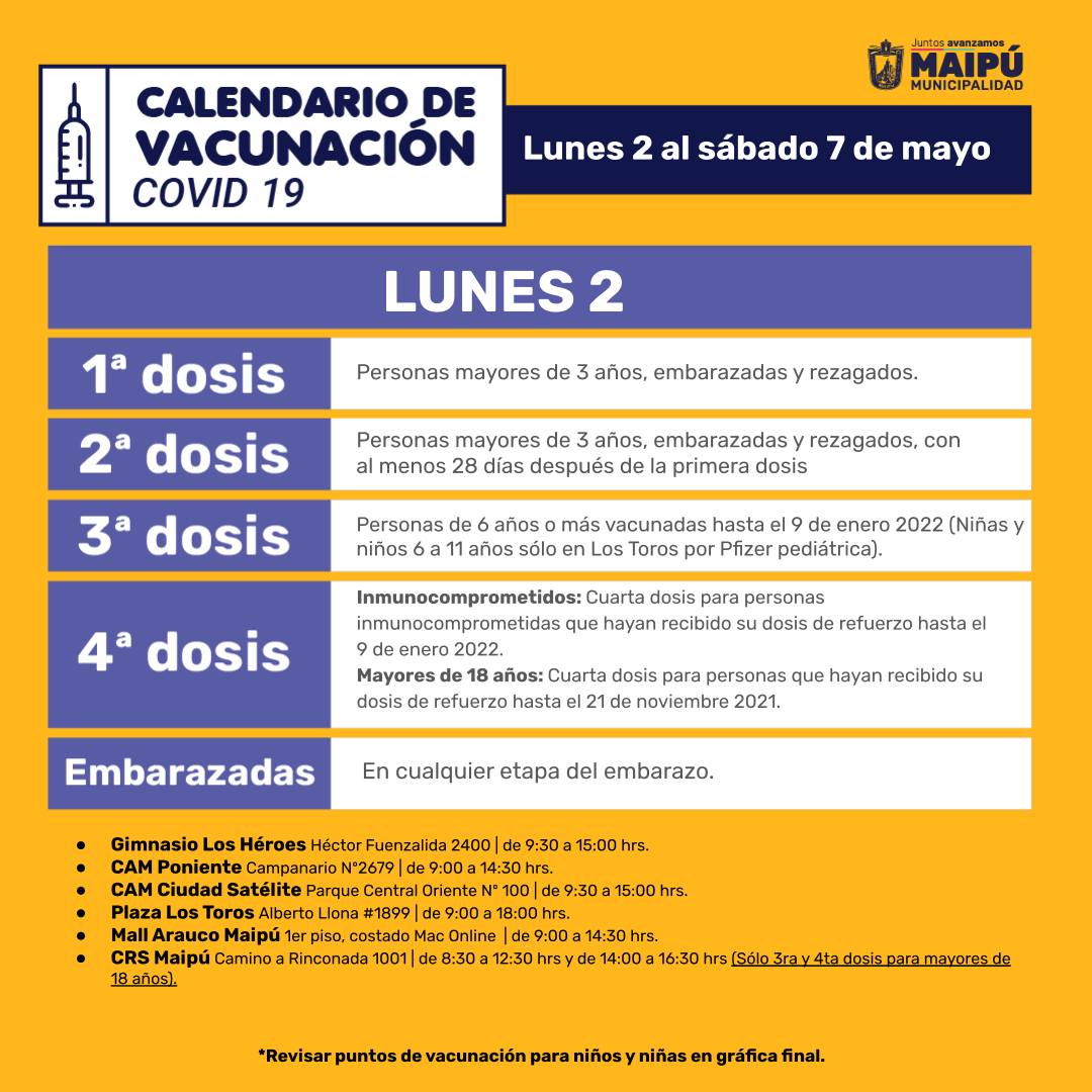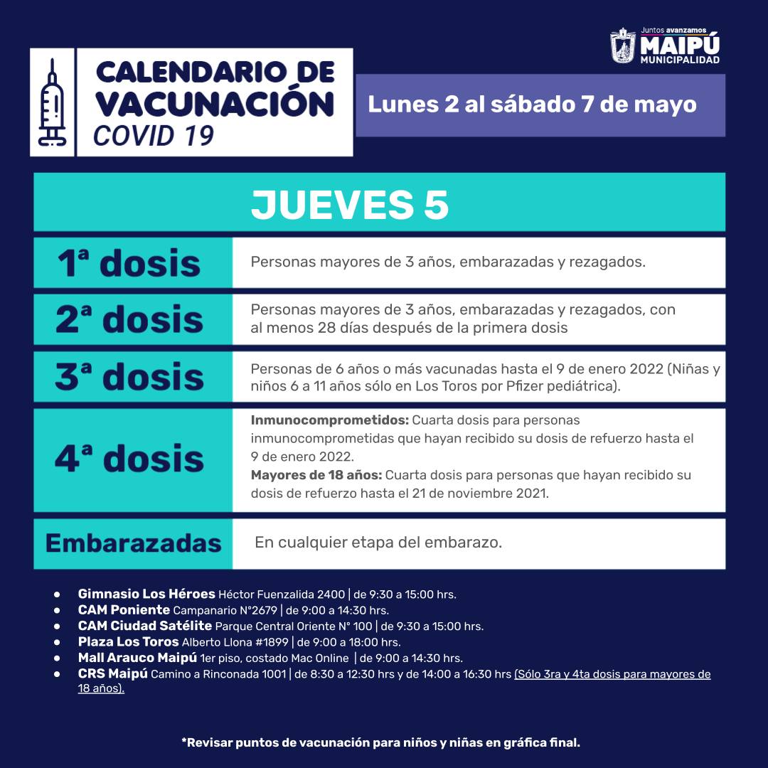 - CRS Maipú (camino a Rinconada 1001) de 8:30 a 12:30 hrs. y de 14:00 a 16:30 hrs. (sólo tercera y cuarta dosis para mayores de 18 años).