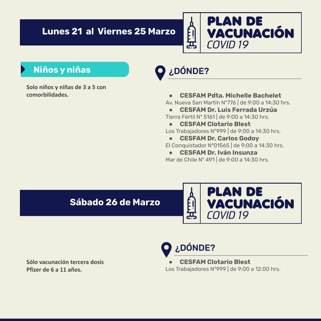 - Ex edificio Registro Civil (costado colegio Gral. San Martín) de 11:00 a 16:30 hrs. (sólo dosis de refuerzo Pfizer para niñas y niños de 6 a 11 años).