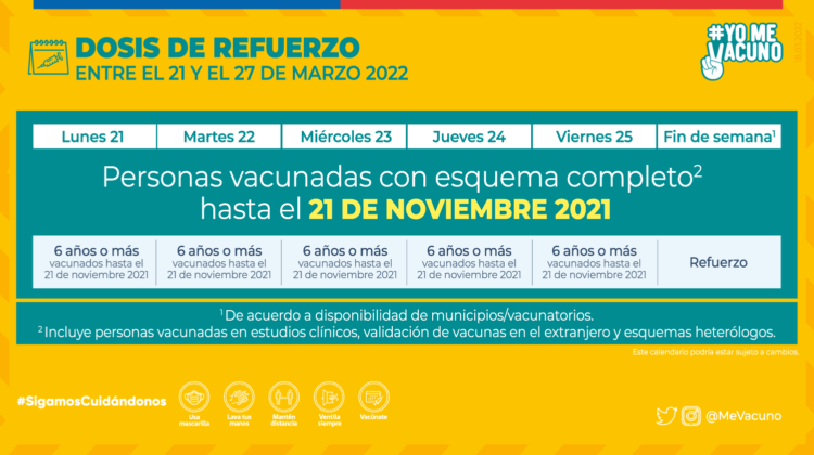 - Tercera dosis de refuerzo a las personas que cuenten con esquema completo hasta el 21 de noviembre 2021 (incluyendo personas vacunada en estudios clínicos, validación de vacunas en el extranjero y esquemas heterólogos).