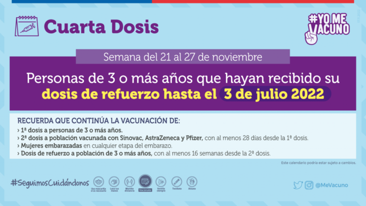 - Cuarta dosis a personas de 3 o más años que hayan recibido su dosis de refuerzo hasta el 3 de julio 2022.