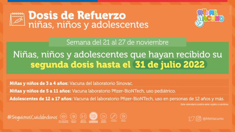 - Dosis de refuerzo a niñas, niños y adolescentes que hayan recibido su segunda dosis hasta el 31 de julio 2022.