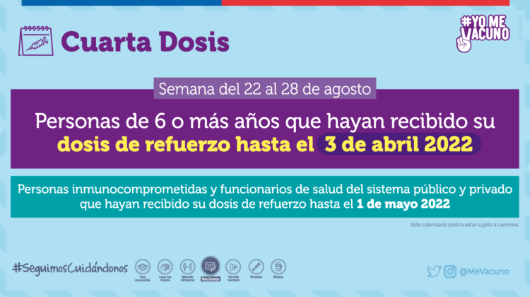 • Cuarta dosis a personas inmunocomprometidas y funcionarios de salud del sistema público y privado que hayan recibido su dosis de refuerzo hasta el 1 de mayo 2022.