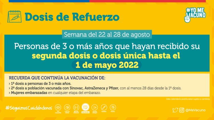 • Dosis de refuerzo a personas de 3 o más años que hayan recibido su segunda dosis o dosis única hasta el 1 de mayo 2022.