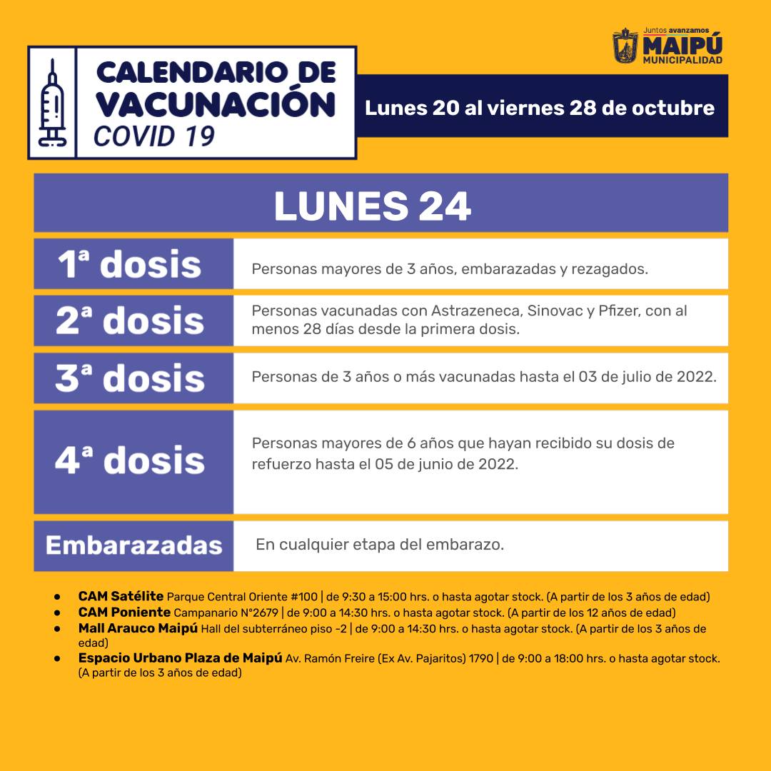 A continuación, el Calendario de vacunación del Ministerio de Salud para la semana del 24 al 30 de octubre de 2022, seguido del Calendario de vacunación de la Municipalidad de Maipú con sus respectivos locales de vacunación y horarios de atención.