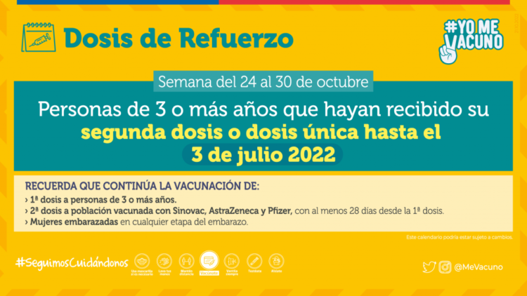 • Dosis de refuerzo a personas de 3 o más años que hayan recibido su segunda dosis o dosis única hasta el 3 de julio 2022.