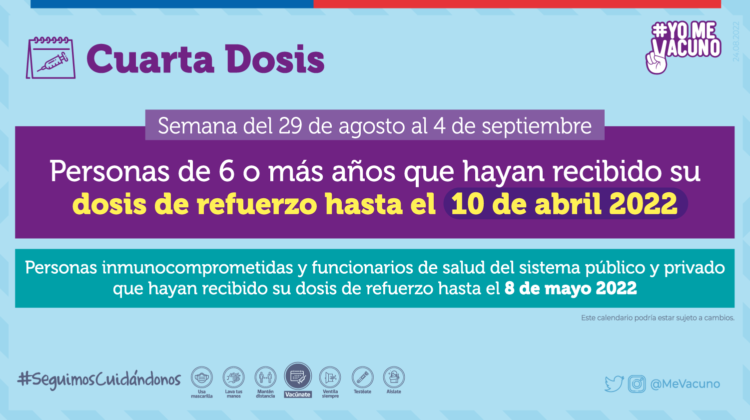 - Cuarta dosis a personas inmunocomprometidas y funcionarios de salud del sistema público y privado que hayan recibido su dosis de refuerzo hasta el 8 de mayo 2022.