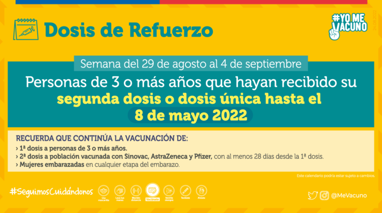 - Dosis de refuerzo a personas de 3 o más años que hayan recibido su segunda dosis o dosis única hasta el 8 de mayo 2022.
