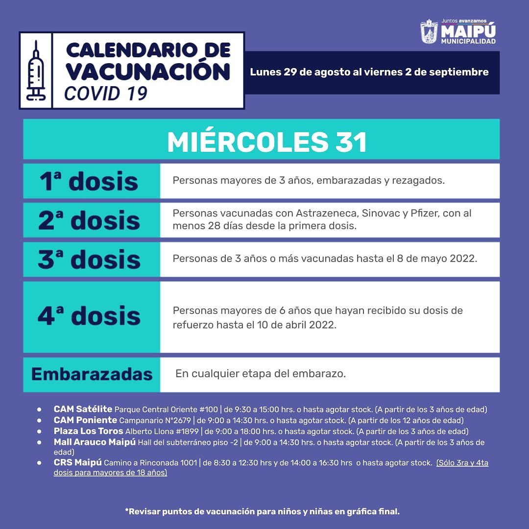 A continuación, el Calendario de vacunación del Ministerio de Salud para la semana del 29 de agosto al 4 de septiembre de 2022, seguido del Calendario de vacunación de la Municipalidad de Maipú con sus respectivos locales de vacunación y horarios de atención.