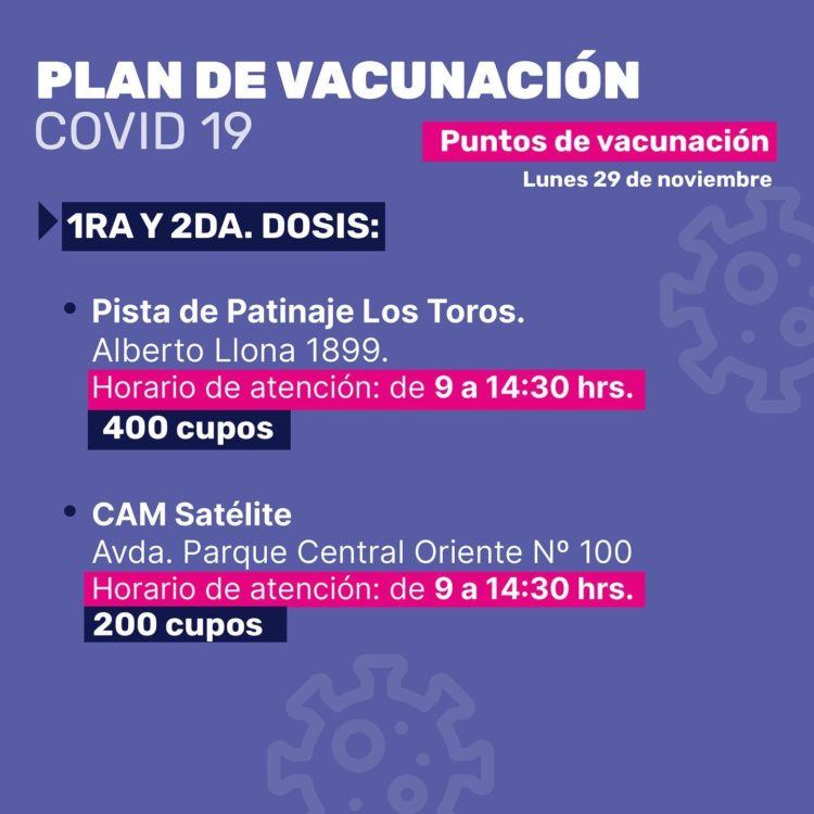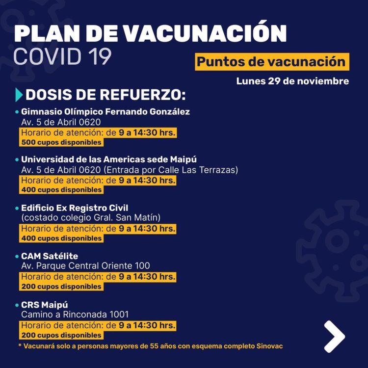 Los siguientes locales de vacunación funcionarán en Maipú con cupos limitados, a partir del día lunes 15 de noviembre (los siguientes días de la semana se informará disponibilidad en las redes sociales del municipio de Maipú):