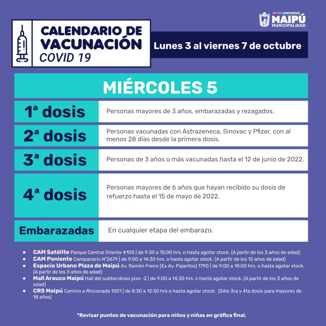 A continuación, el Calendario de vacunación del Ministerio de Salud para la semana del 3 al 9 de octubre de 2022, seguido del Calendario de vacunación de la Municipalidad de Maipú con sus respectivos locales de vacunación y horarios de atención.