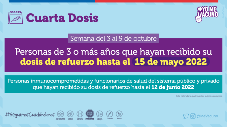 - Cuarta dosis a personas inmunocomprometidas y funcionarios de salud del sistema público y privado que hayan recibido su dosis de refuerzo hasta el 12 de junio 2022.